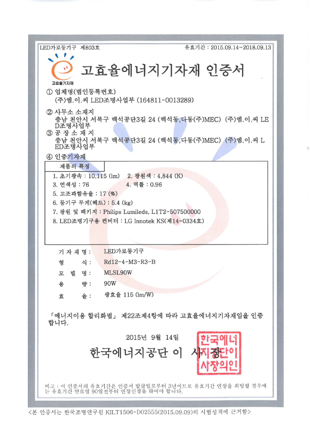 인증 | LED-가로등기구-제-803호-MLSL90W