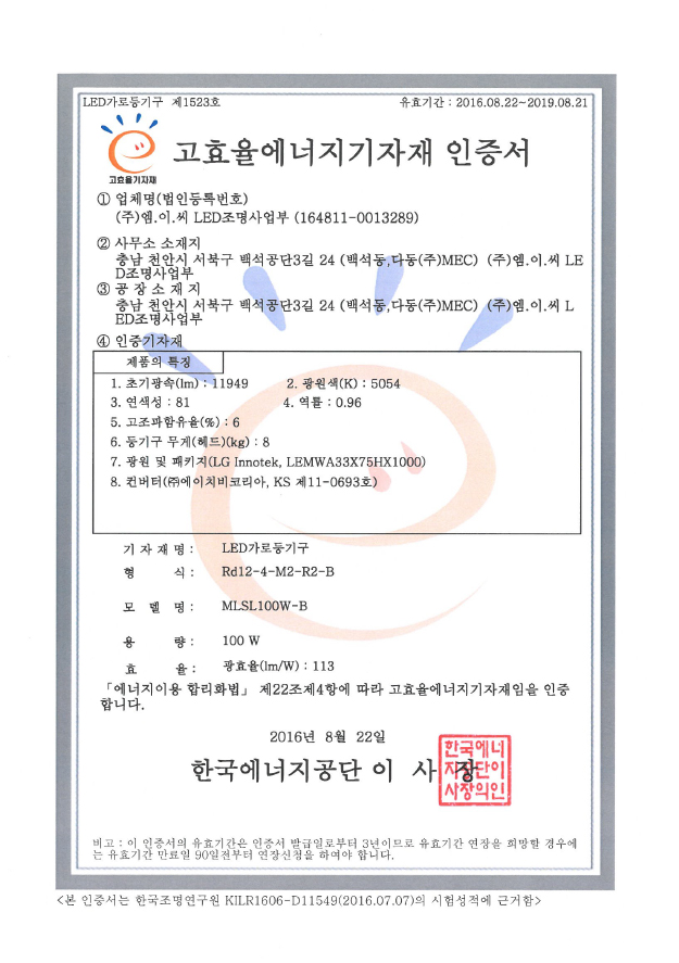인증 | 제1523호-LED-가로등기구_MLSL100W-B