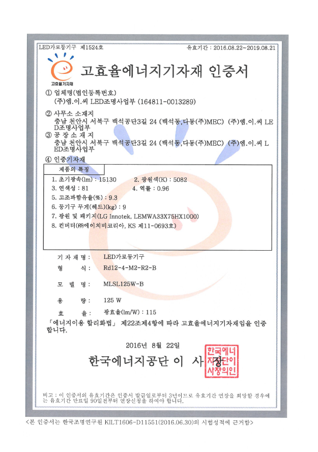 인증 | 제1524호-LED-가로등기구_MLSL125W-B